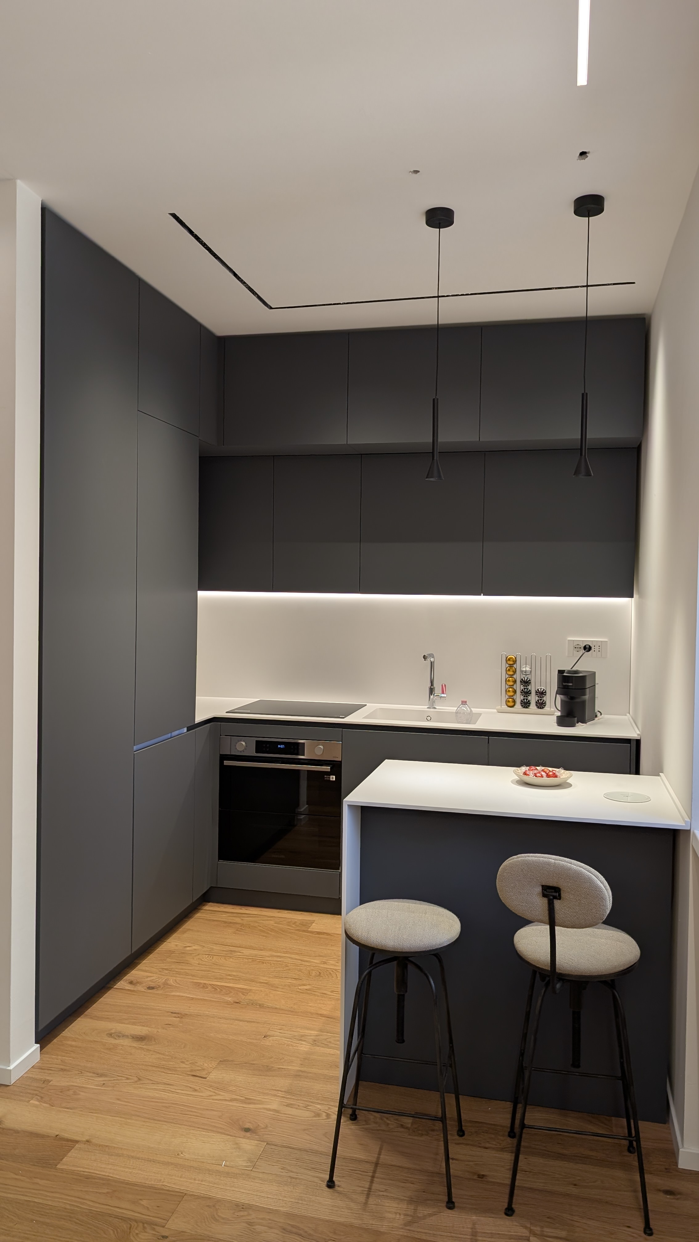 Ante e Fianchi Cucina su misura, Boiserie con porte a scomparsa integrate, in Fenix® NTM  Grigio Bromo